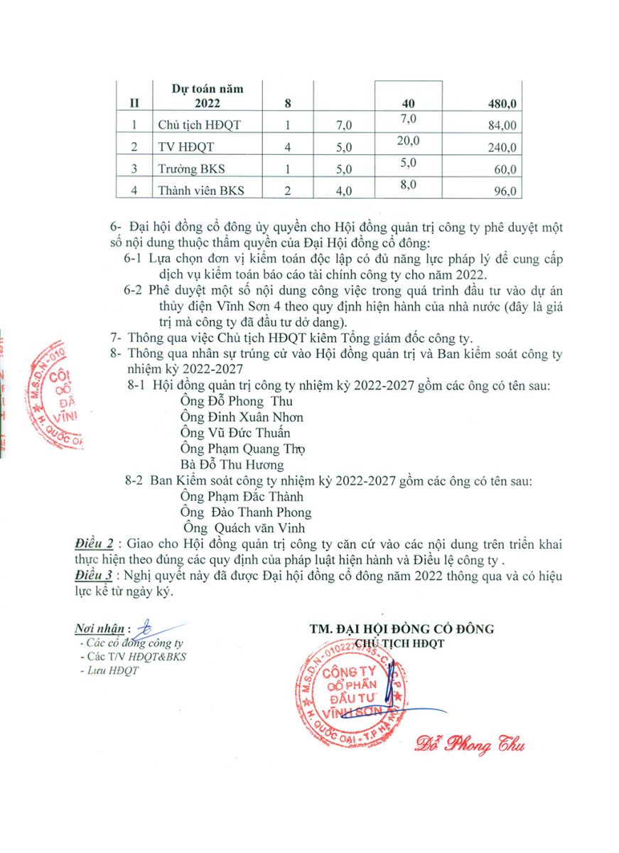Nghị quyết 02/2022/NQ-HĐQT Công ty Cổ phần Đầu tư Vĩnh Sơn